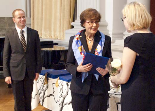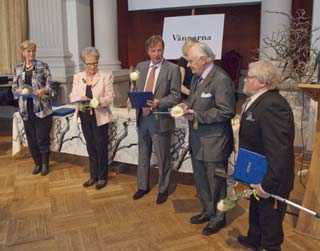 Ann-Mari Häggman får SFV:s kulturpris av kanslichef Johan Aura och biträdande kanslichef Catharina Gripenberg.