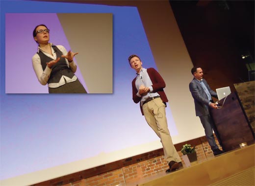 De svenska föreläsarna Yasmine El Rafies och Emanuel Kalrstens inlägg var bland de intressantaste under Mediaspråk 2012. Till höger konferancier Jens Berg, Hbl.