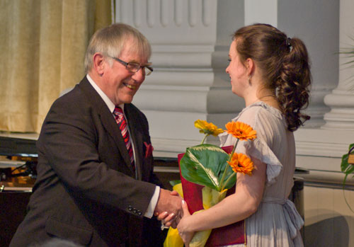 Caj Ehrstedt delar ut priset med samma namn på 5000 euro till Frida Jansson.
