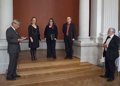 SFV:s kanslichef Christoffer Grönholm (t.v.) och Schildts verkställande direktör Johan Johnson delade ut Johan Johnsons kulturpris i G18:s festsal i Helsingfors 4.5.