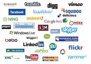 Sociala medier är på allas läppar just nu. Jag avser naturligtvis alla de webbplatser med roliga namn som läsaren ser på bilden. Namnen är bildade genom att kombinera, förvränga eller felskriva engelska ord, eller genom att skriva ut ordet hej på swahili eller det kinesiska ordet för fred med latinska bokstäver.